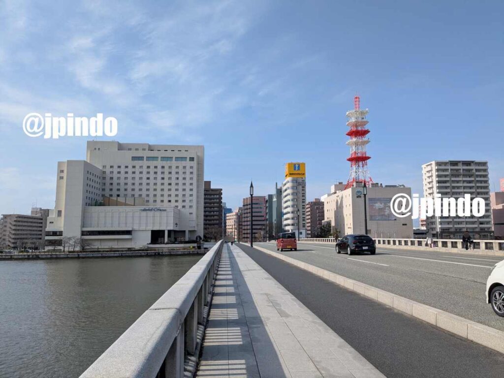信号の先に見える、薄い茶色っぽい建物が、ホテルサンルート新潟です。