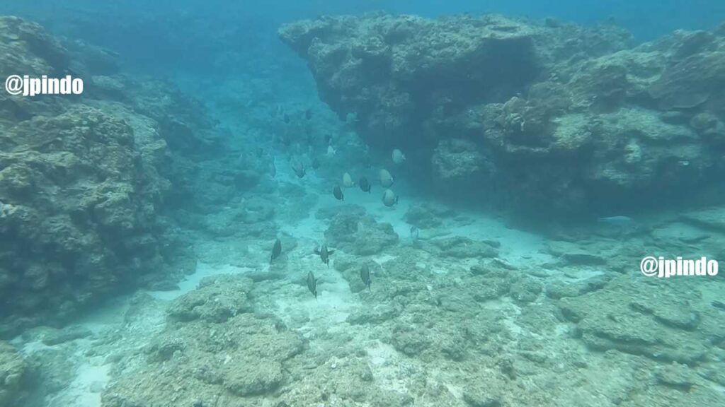 少し深場のところに、魚の群れが集まっていました。カラフルで美しい景色が楽しめました。このように岩場の隙間にたくさんの魚たちが泳いでいることがあるので、スノーケリングする時には、このような場所をチェックしてみるといいと思います。