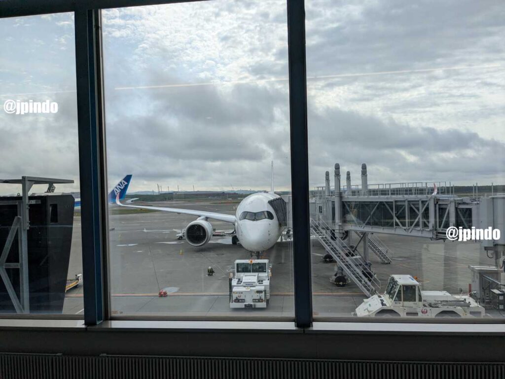 ボーディングブリッジを歩いていると、奥の方にガンダムのラッピングの飛行機があります!
