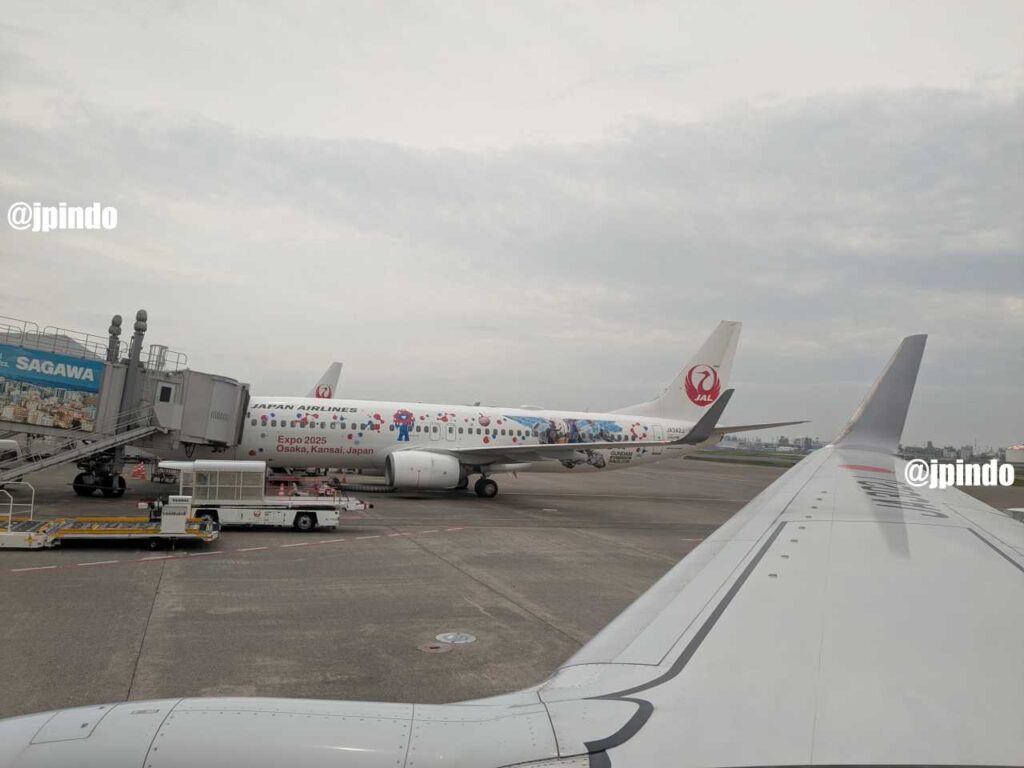大阪万博「ミャクミャク」と「ガンダム」のラッピングがJALの機体に映え、見た目でも楽しめて良かったです。ちょうど座った窓際に、この機体があってラッキーでした。