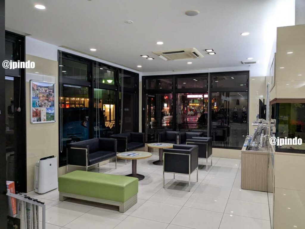 フロントの反対側には、椅子とテーブルが設置されています。目の前がガラスで、外の様子が分かり、待ち合わせの時などにも便利です。