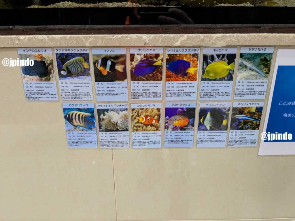 この水槽で泳いでいる魚たちの種類がこちらに書いてあります。魚の種類を覚えるのは大変だと思います。私は何度かシュノーケリングをしているうちに、せっかくなので魚の名前も覚えたいなと思い、最近は少しずつ魚の名前を勉強し始めています。