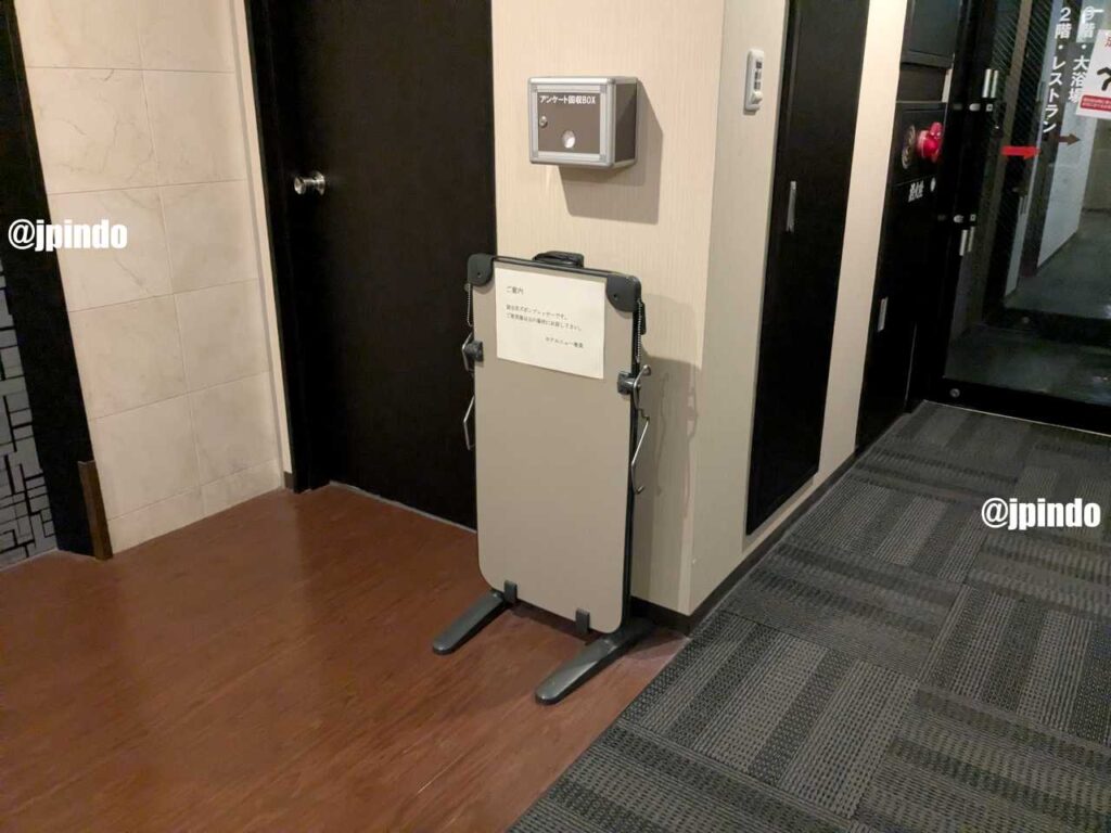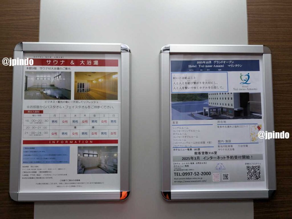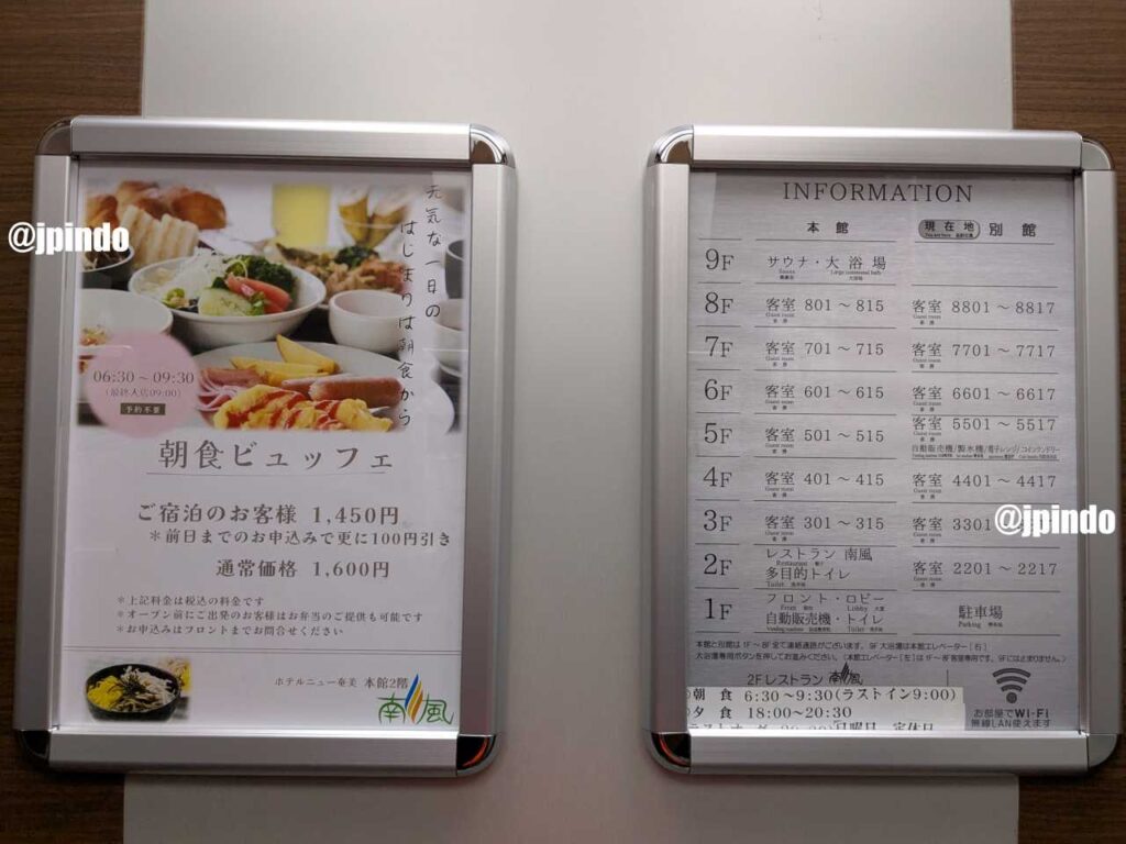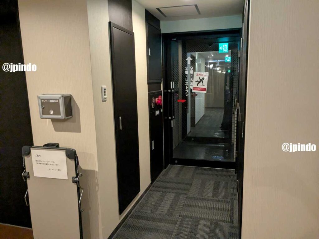 ここのホテルでは大浴場が利用できるので、大浴場の利用時間などについて、フロントのとこにもありましたが、エレベーターの中でも詳細が確認できます。