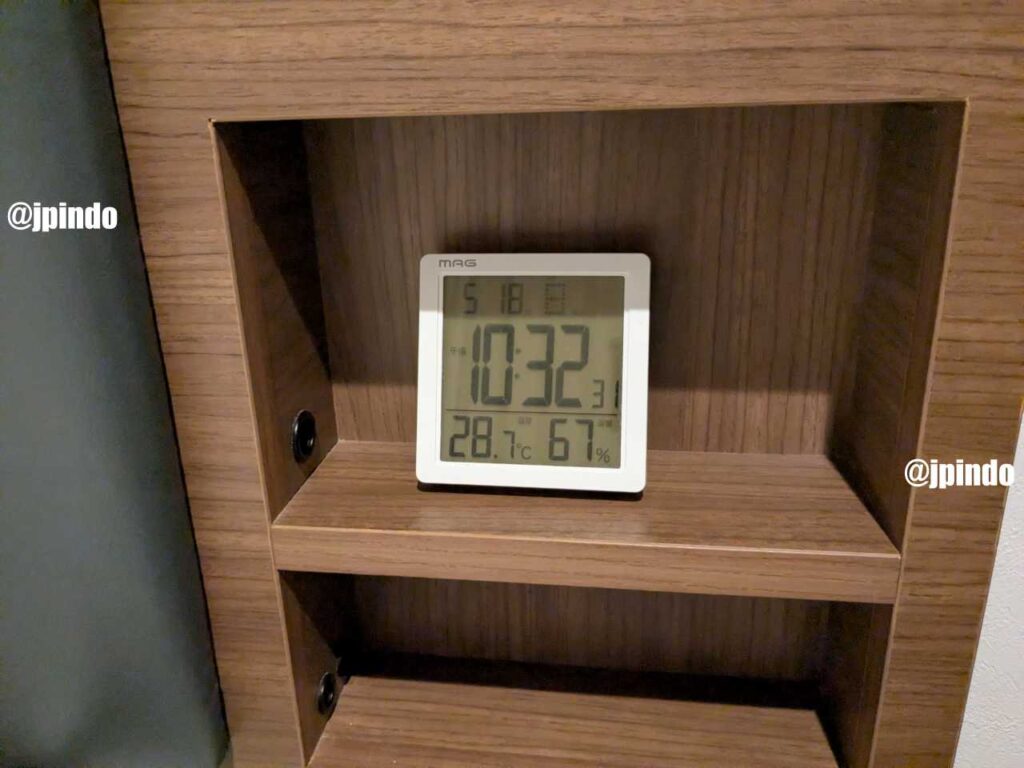 ベッドヘッドのところに、時計があります。こういうタイプの時計があると、表示も見やすいですし、目覚ましなども使いやすくていいなと思います。