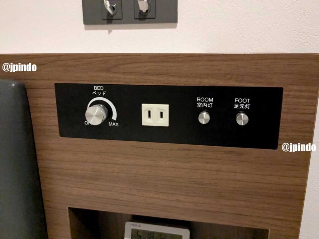 ベッドヘッドのところにある、ライトのコントロール。ここにもコンセントはありました。