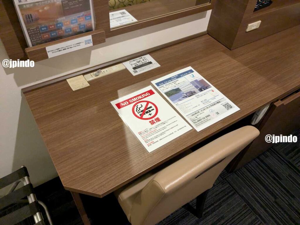 大浴場の案内は、お部屋の中でも確認できるようになっていました。写真の左上の方に、大浴場の利用時間などが書かれたパンフレットがあります。