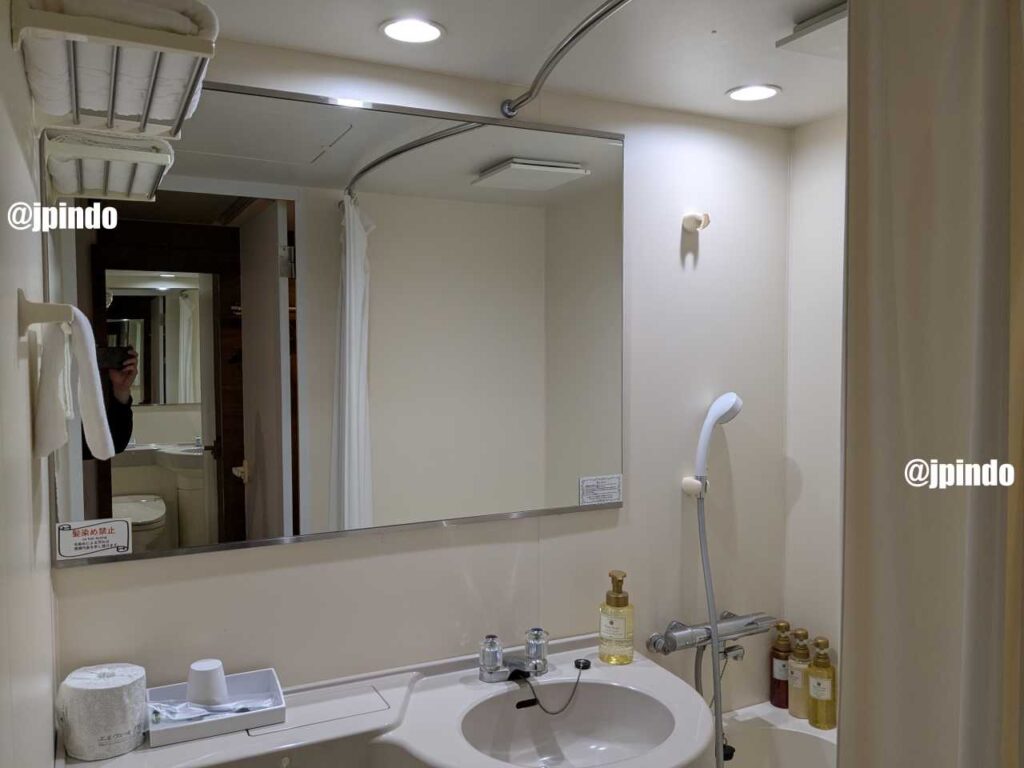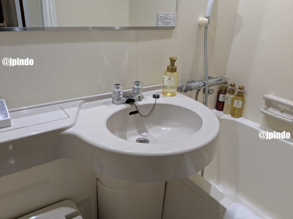 洗面台の雰囲気です。蛇口のノブがお湯と水に分かれています。1回ずつ調整しながら出さなければいけないのが、少し手間がかかるなという印象がありました。