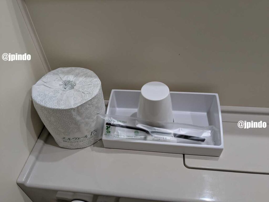 歯ブラシとコップ、予備のトイレットペーパーも置いてあります。